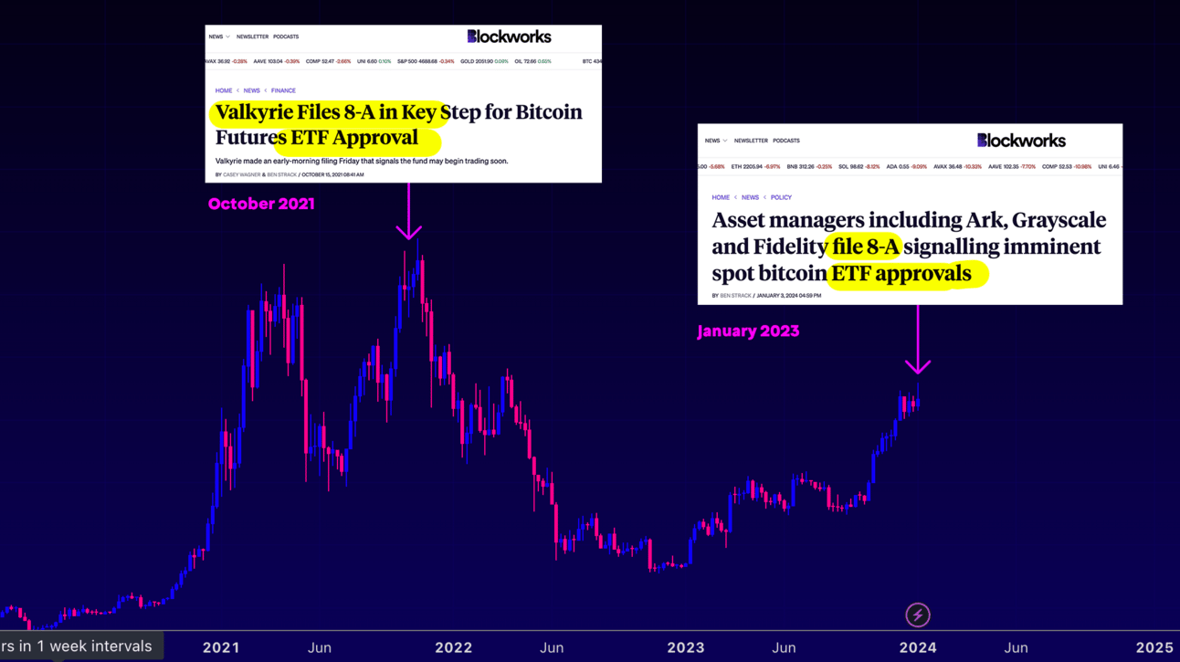 In 2021, we saw very similar headlines to what we’ve been seeing now. Valkyrie, ProShares, VanEck, and others filed Form 8-A with the SEC, which, as mentioned, is a key form signalling imminent approval. This represented one of the final stages in the application process.