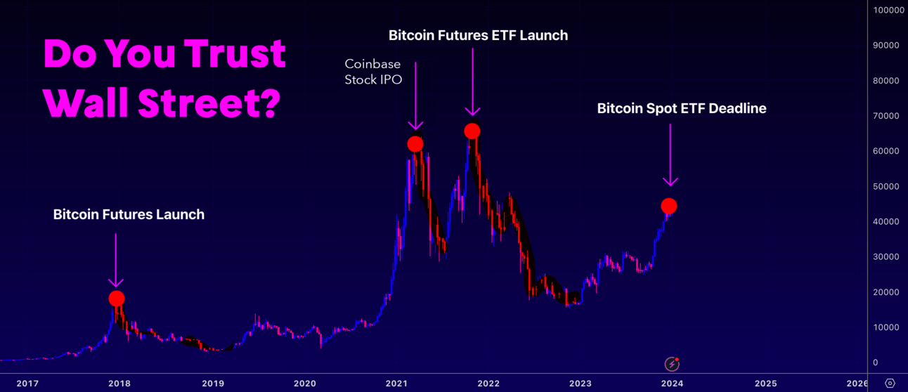The focus should be on Wall Street and their history. Should we trust them to enter the Bitcoin markets with Spot ETFs and believe that this will usher in trillions of dollars of new funds, as many Bitcoin maximalists like Anthony Pompliano and Michael Saylor have predicted?