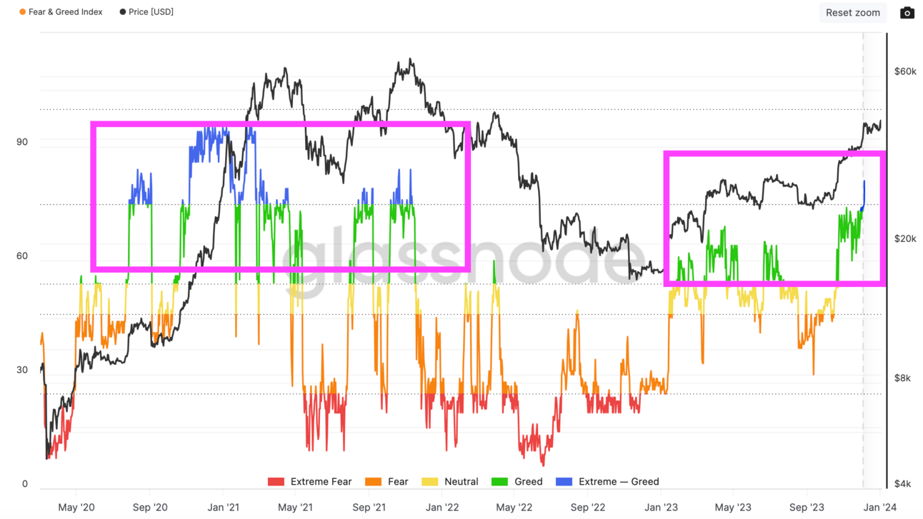 The Fear and Greed Index recently re-entered the extreme greed phase, a common occurrence during market peaks.