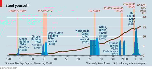 The graphic below, sourced from 'The Economist,' provides a clear visualization of the economic downturns that have historically followed the construction of the world's tallest skyscrapers.