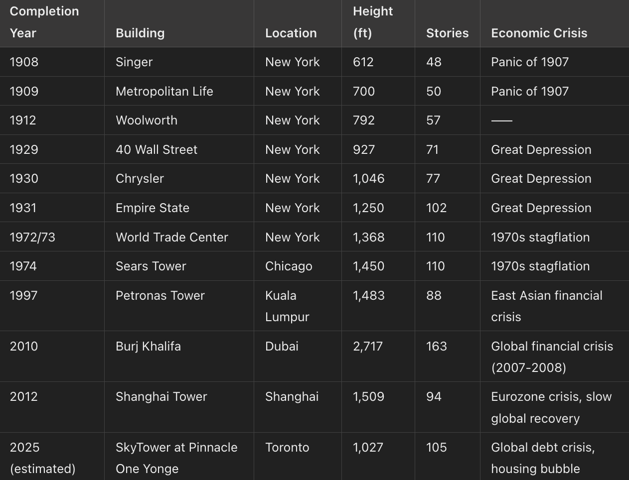 Despite these challenges, the skyscraper index has a good track record for predicting significant economic downturns. Here’s a list we’ve made: